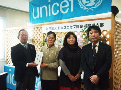 ユニセフ委員長の丹治洋子さん、理事の瓶子幸子さん、管理部長の宍戸義広さんが福島県支部を訪れ、菅田俊雄広報担当に寄託していただきました。